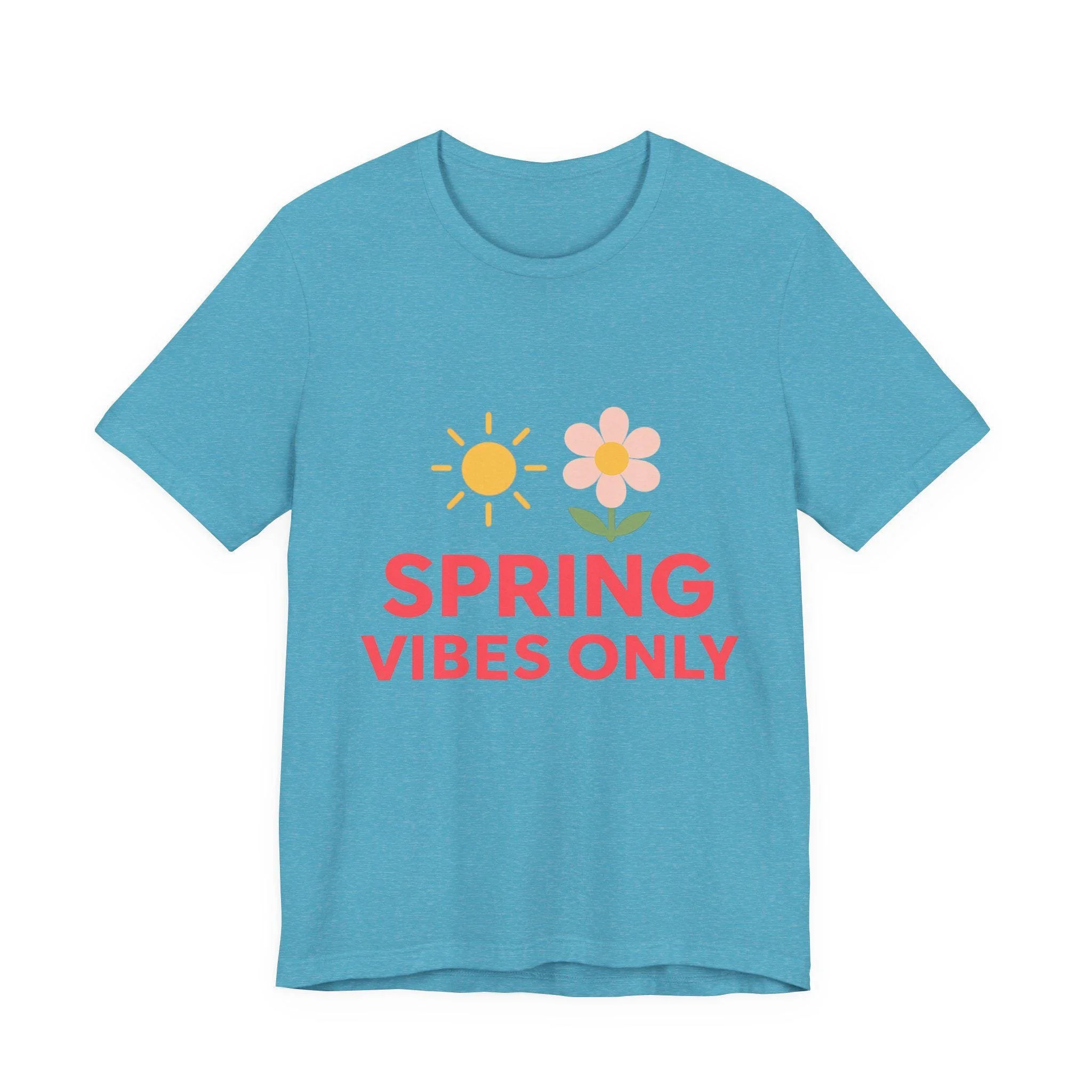 Lightweight and breathable, this soft cotton tee carries a sunny, playful message: a cheerful sun and blossom float above bold “SPRING VIBES ONLY” lettering.
